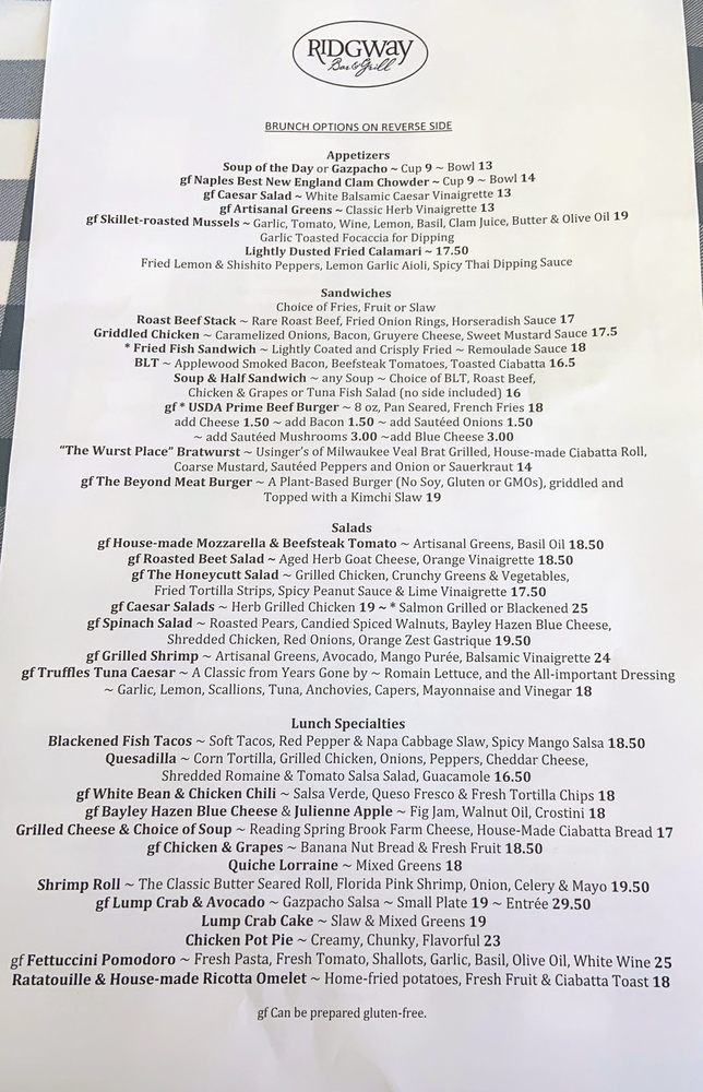 Ridgway Bar & Grill offers a diverse menu packed with flavorful options to satisfy any palate. From Bread Service to Shishito Peppers and Parker House Rolls, to Soup of the Day and Gazpacho, there is something for everyone. The appetizers like Crispy Calamari and Lump Crab & Avocado Gazpacho Salsa are sure to impress with their delicate flavors and expert preparation. The atmosphere at Ridgway Bar & Grill is charming and inviting, perfect for a casual brunch with friends or a special dinner celebration. With a focus on quality ingredients and attentive service, this restaurant is a must-visit in Naples, FL. Don't miss out on the chance to experience the outdoor seating area and enjoy the lovely garden setting while indulging in delicious dishes.